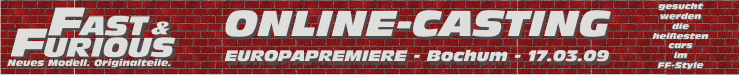 Eigentlich wollten wir Euch an dieser Stelle Informationen zur Europa Film Premiere von Fast & Furious 7 in Berlin am 15.03.2015 bekanntgeben . Eigentlich sollten dort auch wieder die Filmstars persönlich erscheinen und wir sollten eigentlich wieder die Fahrzeuge für den roten Teppich per Casting finden. Soweit war auch alles bestens vorbereitet und kurz vor der Veröffentlichung und dem Start des Castings erreichte uns dann von Universal Pictures die traurige Nachricht, dass alle Premierenevents von Fast & Furious 7 für Berlin, Abu Dhabi und Argentinien nicht stattfinden werden. Es wird sich jetzt auf einen grosses Event in Los Angeles konzentriert. Glücklicherweise sind wir jedoch seit Dezember mit Vorbereitungen der Film Premiere von Fast & Furious 7 im Autokino Essen beschäftigt und werden Euch dort eine geniale Premierenparty bieten: Schaut einfach mal rein: |